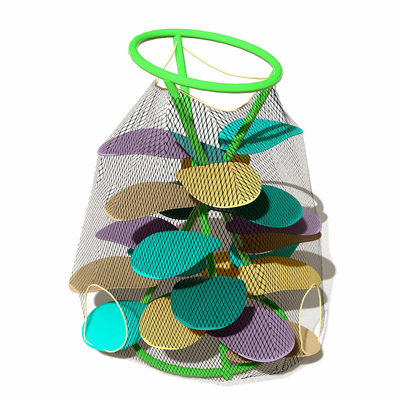 Это коммерческое игровое оборудование для лазанья, оформленное в виде листьев, предназначенное для детей в возрасте от 3 до 12 лет, сочетает в себе многослойную пластиковую раму для лазанья (с деревянными ступеньками в форме листьев) и закрытую веревочную сетку.