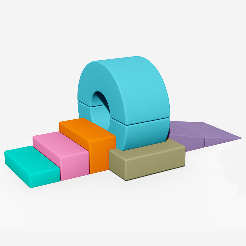 Компоненты: изогнутые модули с мягкой дугой, ступенчатые мягкие блоки, наклонные мягкие пандусы, взаимосвязанные соединительные детали.