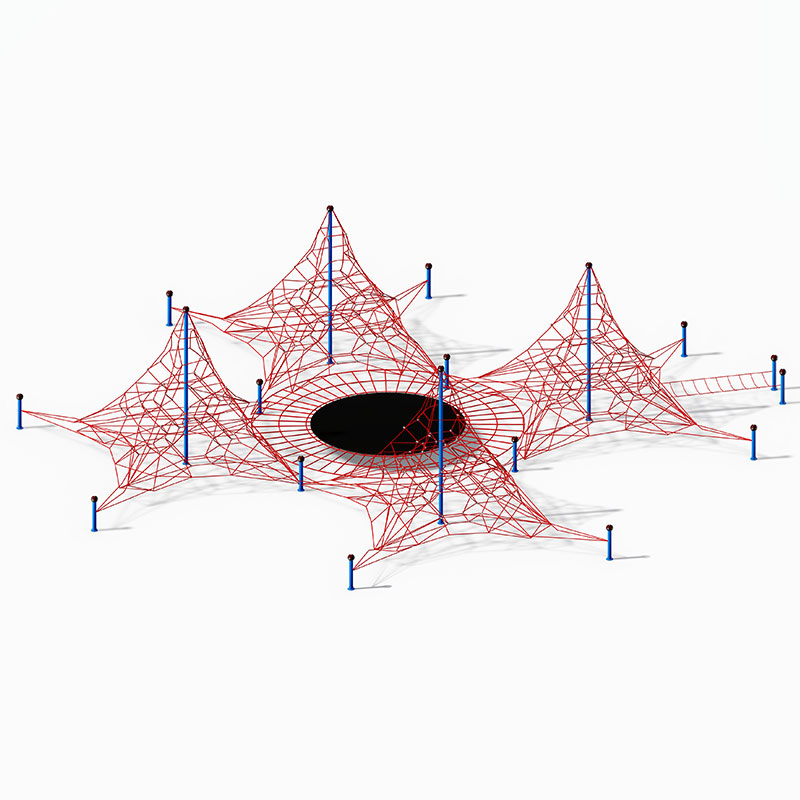 Это коммерческое игровое оборудование для скалолазания в форме звезды, предназначенное для детей в возрасте от 3 до 12 лет (вариант игровых площадок с сеткой высшего уровня), имеет раскидистую структуру из веревочной сетки в виде паутины и центральный модуль батута.